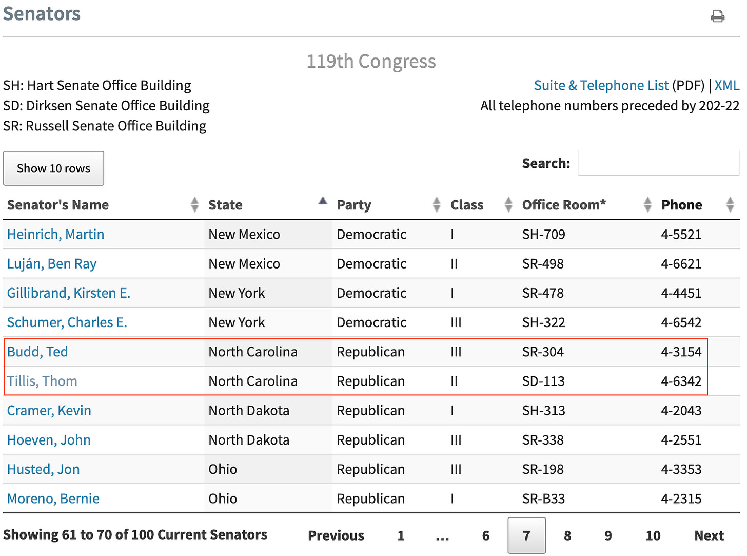 The list of US Senators can be found on the Senate Website. Click the “State” header on the table to sort by state and then scroll until you locate your senators. The last five digits of the phone number for their DC office is listed in the far right column. To construct the full phone number prefix that with (202) 22. For example I live in North Carolina so this is what I see: